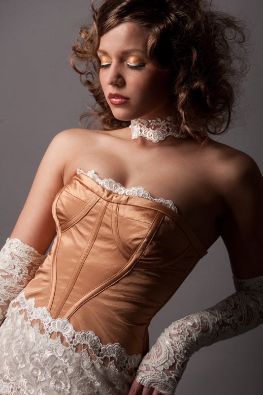 | Bodenlanges Bustierkleid aus Duchesse-Seide und edler Spitze. |